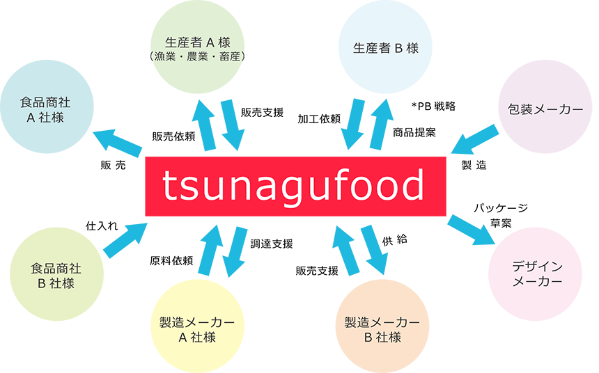 生産者と消費者、生産者と生産者というヒトとヒトが繋がる仕組みづくりやパッケージやケータリング等、食が豊かにに楽しくなるコトの提案を会社のミッションとします。